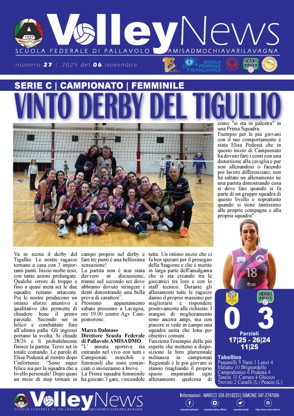 VOLLEYNEWS AMIS-ADMO - n. 27/2025 del 06 novembre 2025 - SettimanaleE' stato pubblicato il numero 27, anno 2025, del settimanale che raccoglie tutte le news, foto, risultati e classifiche delle nostre squadre.